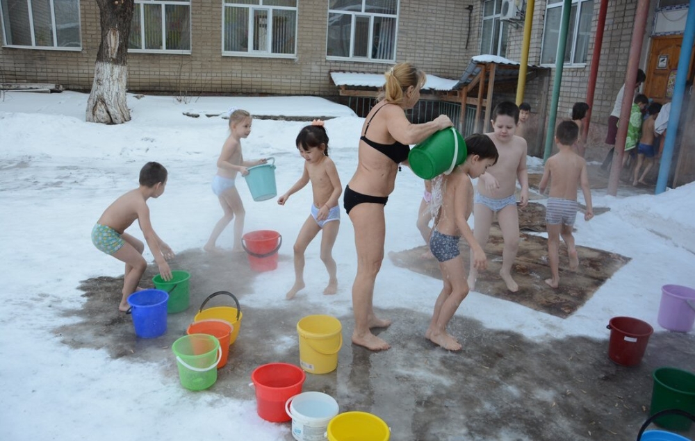 - Fiecare caregiver trebuie să ne amintim că, în călire grădiniță ar trebui să se concentreze pe deplin asupra stării copilului. Copilul nu ar trebui să aibă nici un sentiment de teamă, el nu plânge. Atenuarea, prin urmare, efectuată într-un mod jucaus.