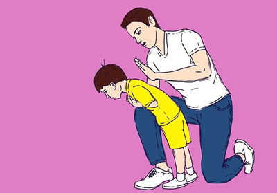 Cu cealalta mana, folosind podul palmei, trebuie sa lovesti ferm si rapid de 5 ori, exact intre umeri. Alimentul cu care cel mic s-a inecat va fi scuipat in timpul loviturilor aplicate in spate.