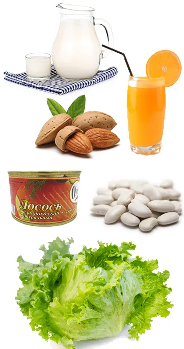 - carne și ulei de pește, gălbenuș, brânzeturi, ciuperci : surse naturale de vitamina D, alimentele fortificate din comerț (cu adaos de vitamina D); expunerea la soare este necesară pentru metabolismul vitaminei D, care, la rândul ei, este necesară pentru metabolismul calciului și dezvoltarea sistemului osos;